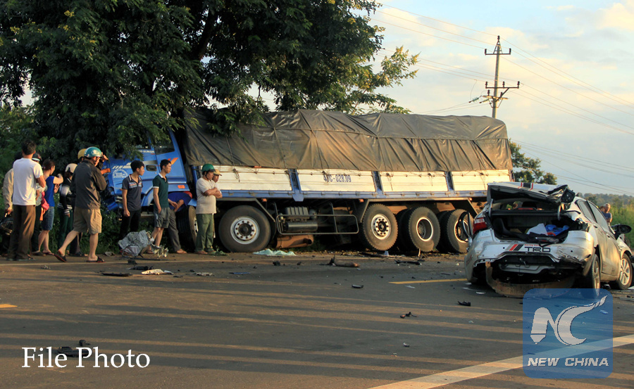 Photo taken on Aug. 20, 2015 shows a car damaged in an accident in Dak Nong province, Vietnam's Central Highlands. (Xinhua/VNA)