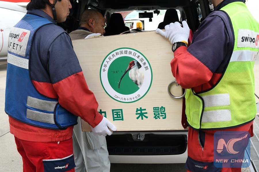 A pair of crested ibises from China arrive in Japan's Narita Airport, Oct. 17, 2018. (Xinhua/Hua Yi)