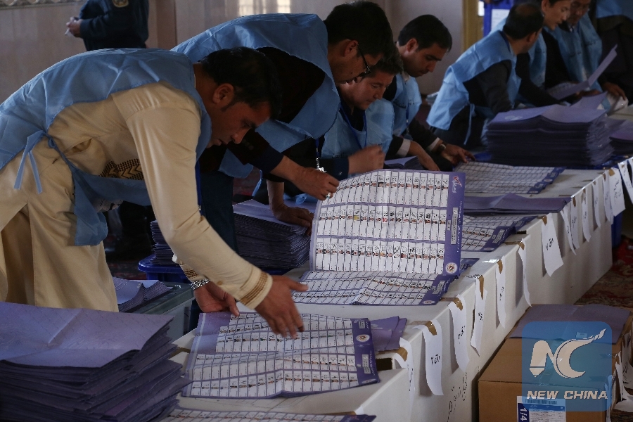 Afghan Independent Election Commission (IEC) workers count ballots during parliamentary elections at a polling center in Kabul, capital of Afghanistan, on Oct. 21, 2018. (Xinhua/Rahmine)
