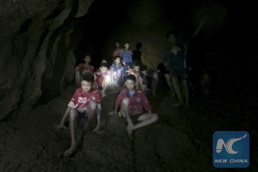 File Photo provided by Thai Navy Seal shows trapped teenagers in a cave in Mae Sai, Chiang Rai province, northern Thailand, on July 2, 2018. (Xinhua)