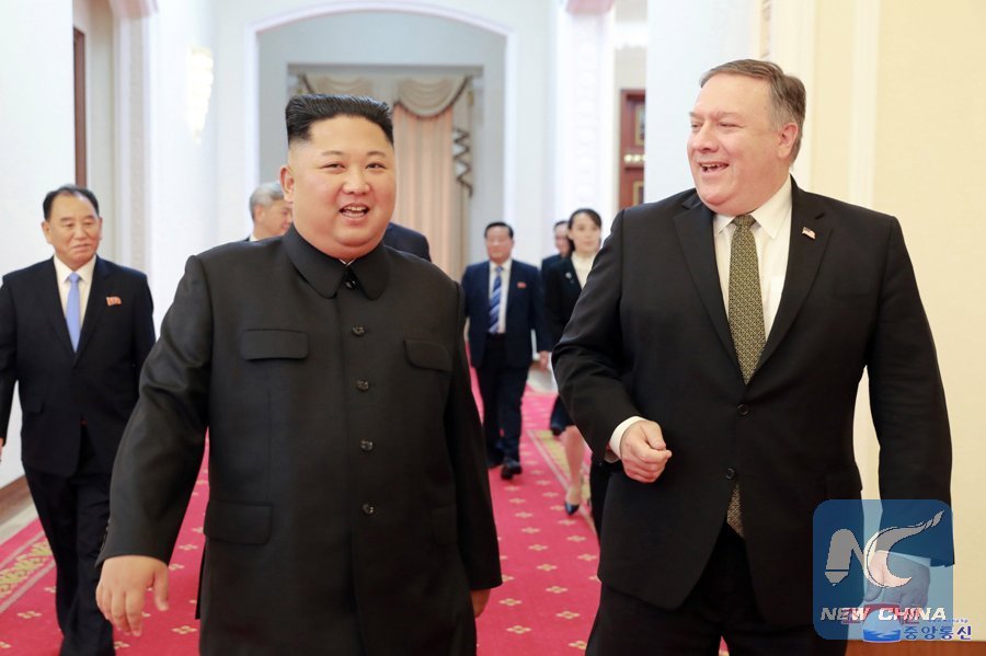 Photo provided by the Korean Central News Agency (KCNA) shows top leader of the Democratic People's Republic of Korea (DPRK) Kim Jong Un (L) talking with visiting U.S. Secretary of State Mike Pompeo in Pyongyang, DPRK, Oct. 7, 2018. (Xinhua/KCNA)