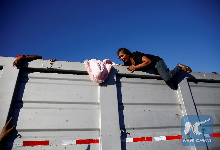 A migrant woman, part of a caravan of thousands traveling from Central America en route to the United States, tries to get off from the back of a truck while making their way to Tijuana from Mexicali, in Mexicali, Mexico, Nov. 20, 2018. (Xinhua/REUTERS)