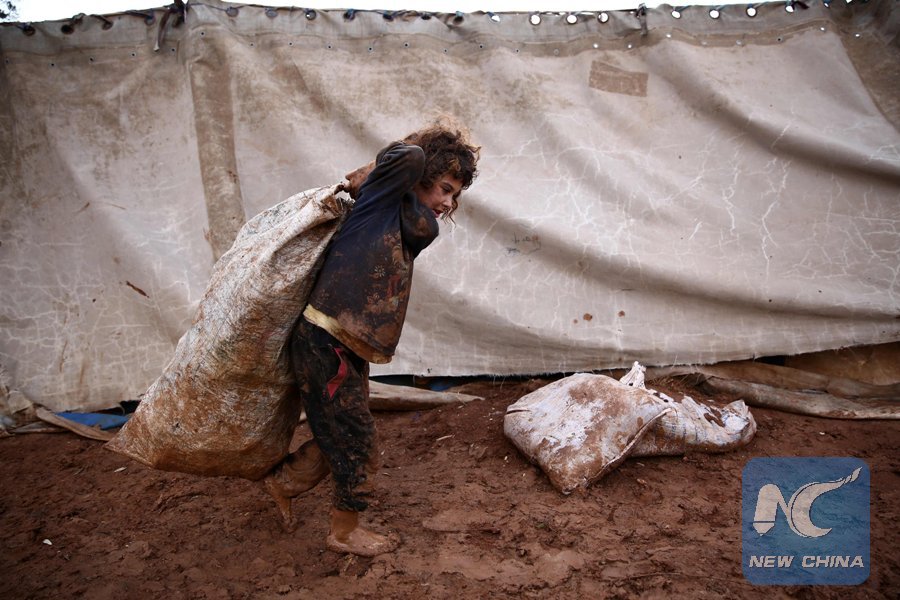 A Syrian child pulls over his back a sack while walking in the mud at a camp for the displaced near the village of Shamarin, near the border with Turkey in the northern Aleppo province, on Dec. 6, 2018. (Xinhua/AFP)