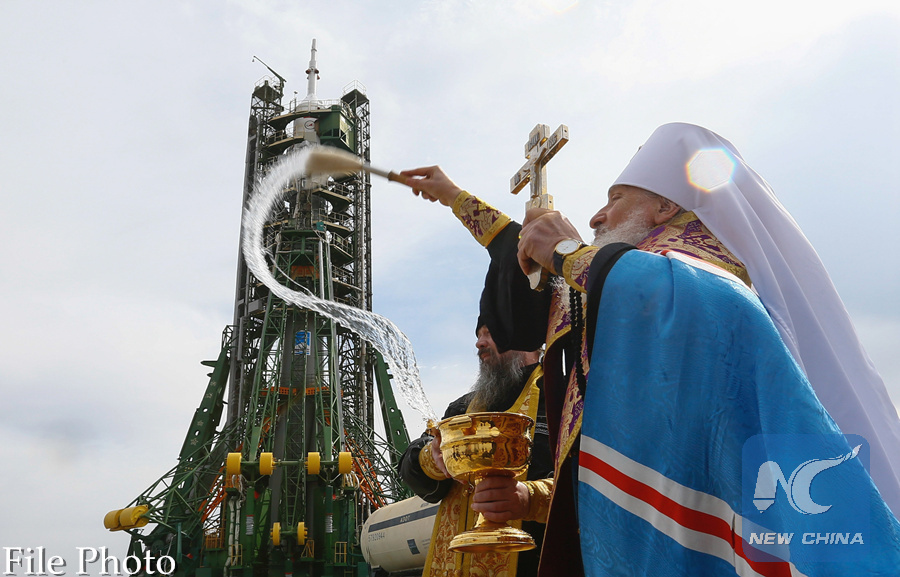 An Orthodox priest conducts a blessing in front of the Soyuz MS-08 spacecraft set on the launchpad ahead of its upcoming launch with International Space Station crew, at the Baikonur Cosmodrome in Kazakhstan March 20, 2018. (REUTERS PHOTO)