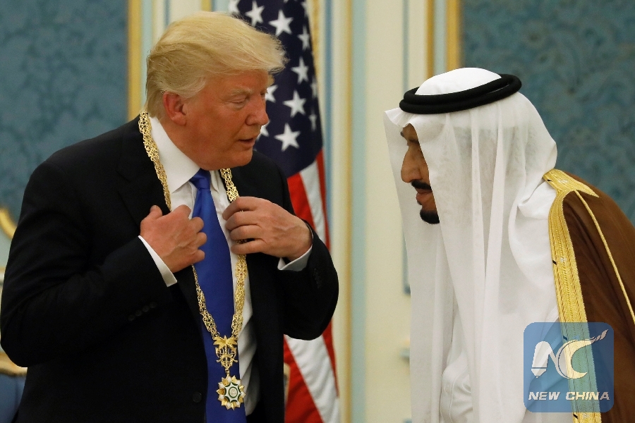 File Photo: Saudi Arabia's King Salman bin Abdulaziz Al Saud (R) presents U.S. President Donald Trump with the Collar of Abdulaziz Al Saud Medal at the Royal Court in Riyadh, Saudi Arabia May 20, 2017. (Xinhua/REUTERS)