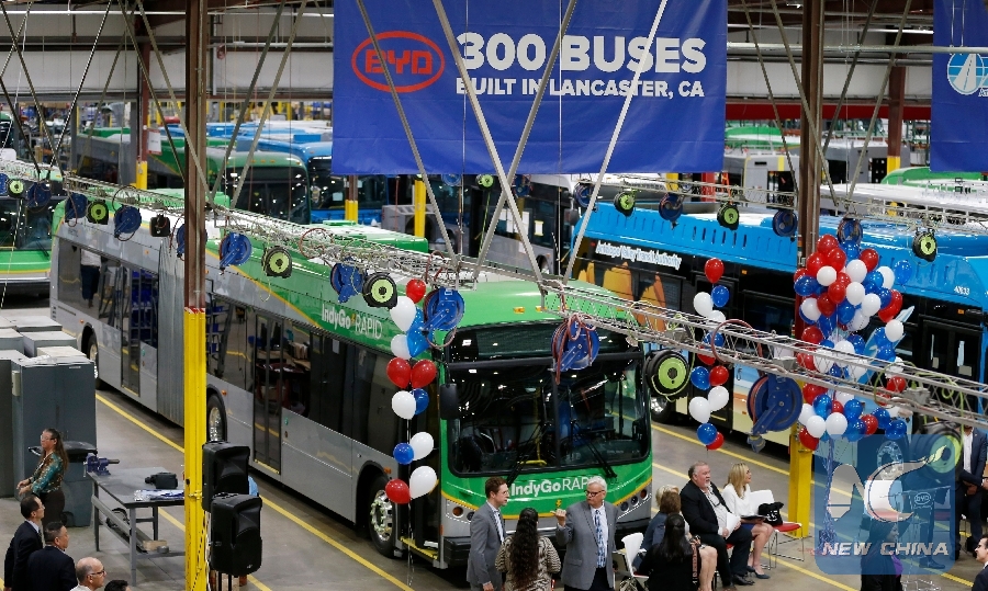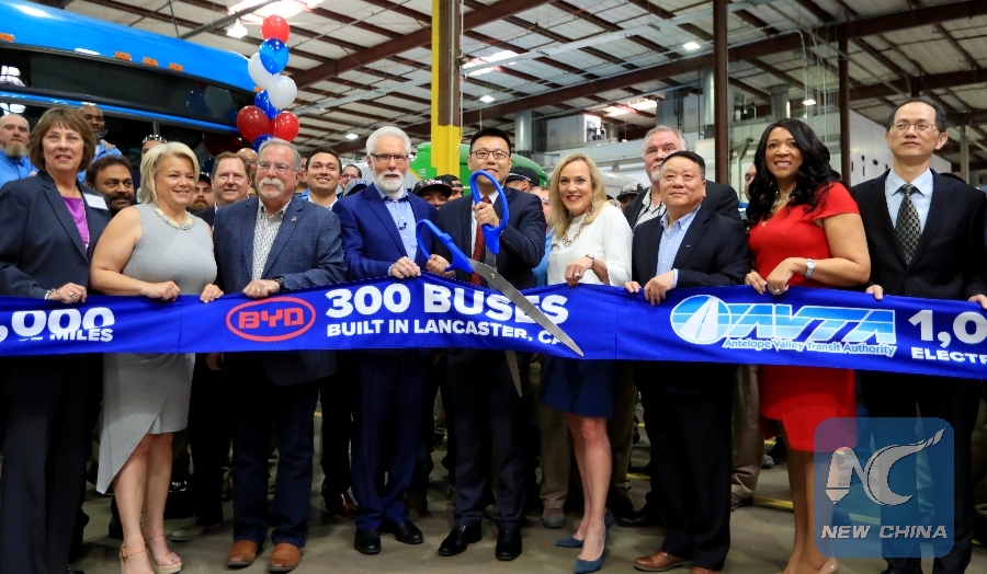 LOS ANGELES, April 4 (Xinhua) -- China's leading electric vehicle maker BYD held a ceremony on Wednesday to mark the completion of the 300th electric bus at its Lancaster manufacturing plant in the U.S. state of California.