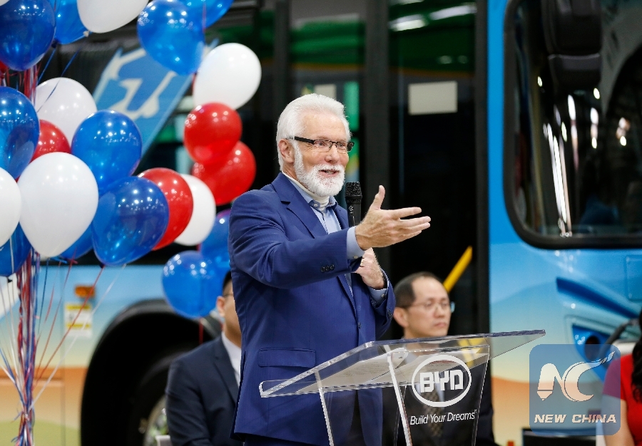 Lancaster Mayor R. Rex Parris delivers a speech at the 300th BYD electric bus offline ceremony in Lancaster, Los Angeles County, the United States, April 3, 2019. (Xinhua/Li Ying)