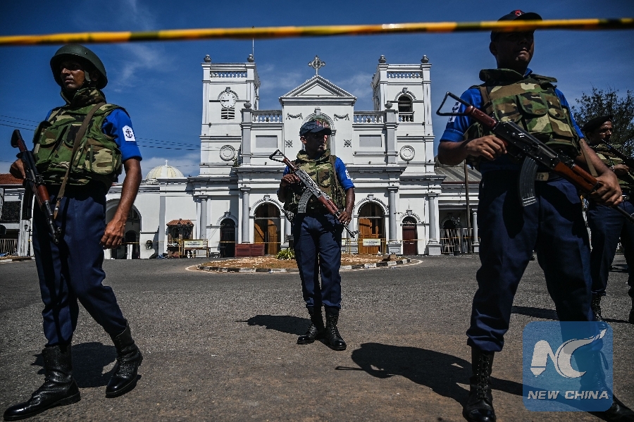 Security personnel stand guard outside St. Anthony's Shrine in Colombo on April 22, 2019, a day after the church was hit in a series of bomb blasts targeting churches and luxury hotels in Sri Lanka. (Xinhua/AFP)