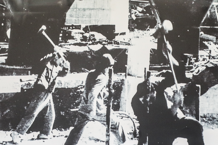 Copy photo taken on July 4, 2019 shows workers repairing a plant in 1949 displayed at the museum of Ansteel Group in Anshan, northeast China's Liaoning Province. (Xinhua/Pan Yulong)