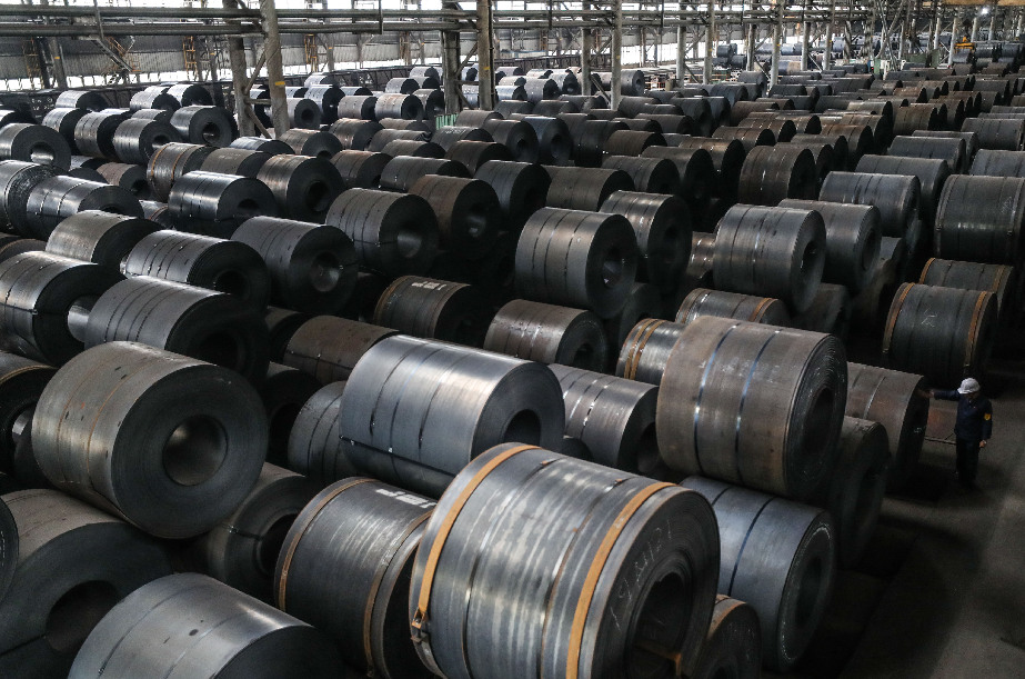 A worker inspects products at the steel coil storage area of a hot-rolled strip steel plant of Ansteel Group Co., Ltd. in Anshan, northeast China's Liaoning Province, July 5, 2019. (Xinhua/Pan Yulong)