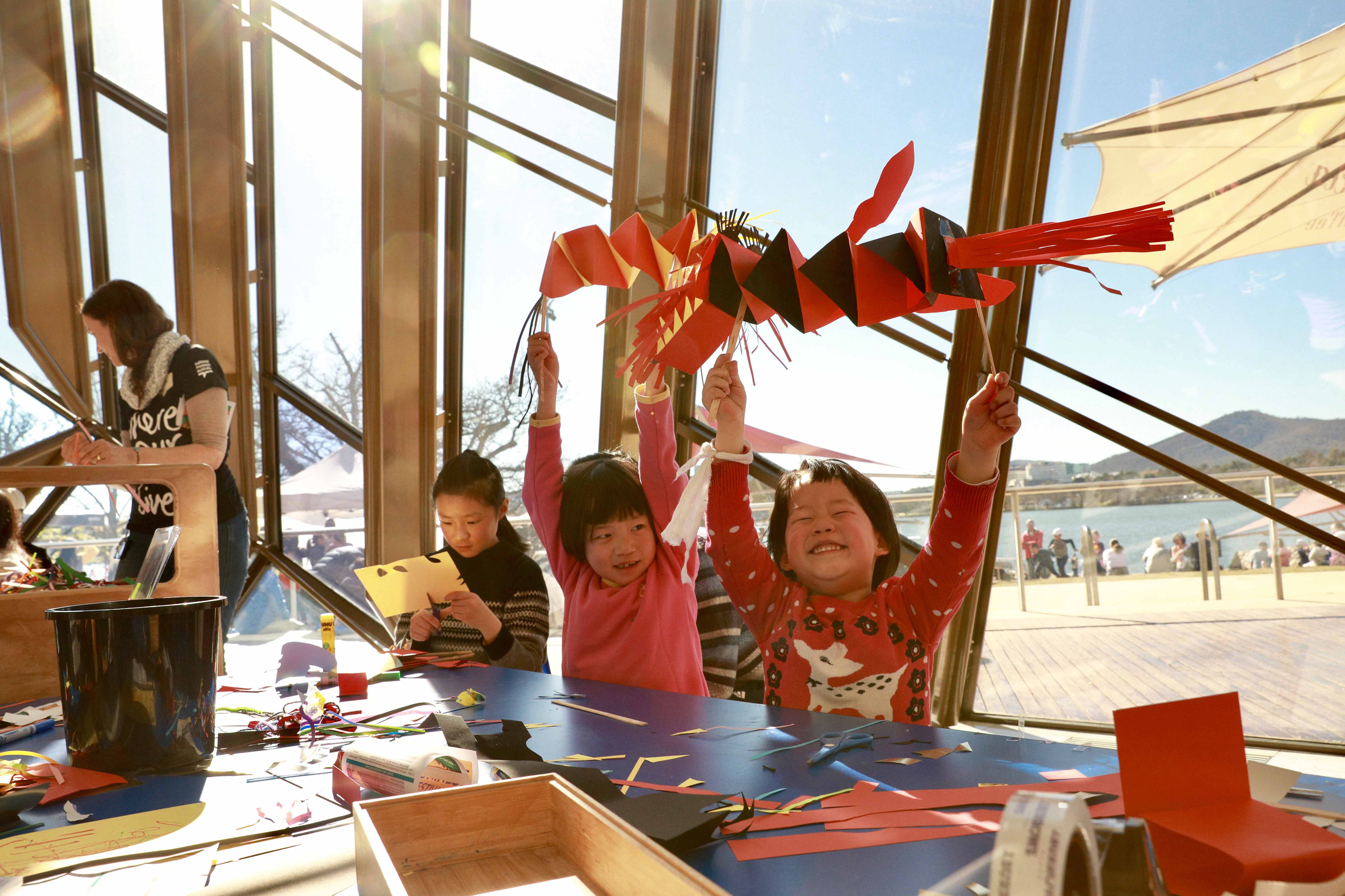 Children take part in the Chinese Festival Day event at the National Museum of Australia in Canberra, Australia, July 21, 2019. As children and their parents were making paper dragons or lions, some seniors sat down to enjoy Chinese dances and songs in the National Museum of Australia on Sunday, when the Chinese Festival Day attracted thousands of visitors. (Photo by Chu Chen/Xinhua)