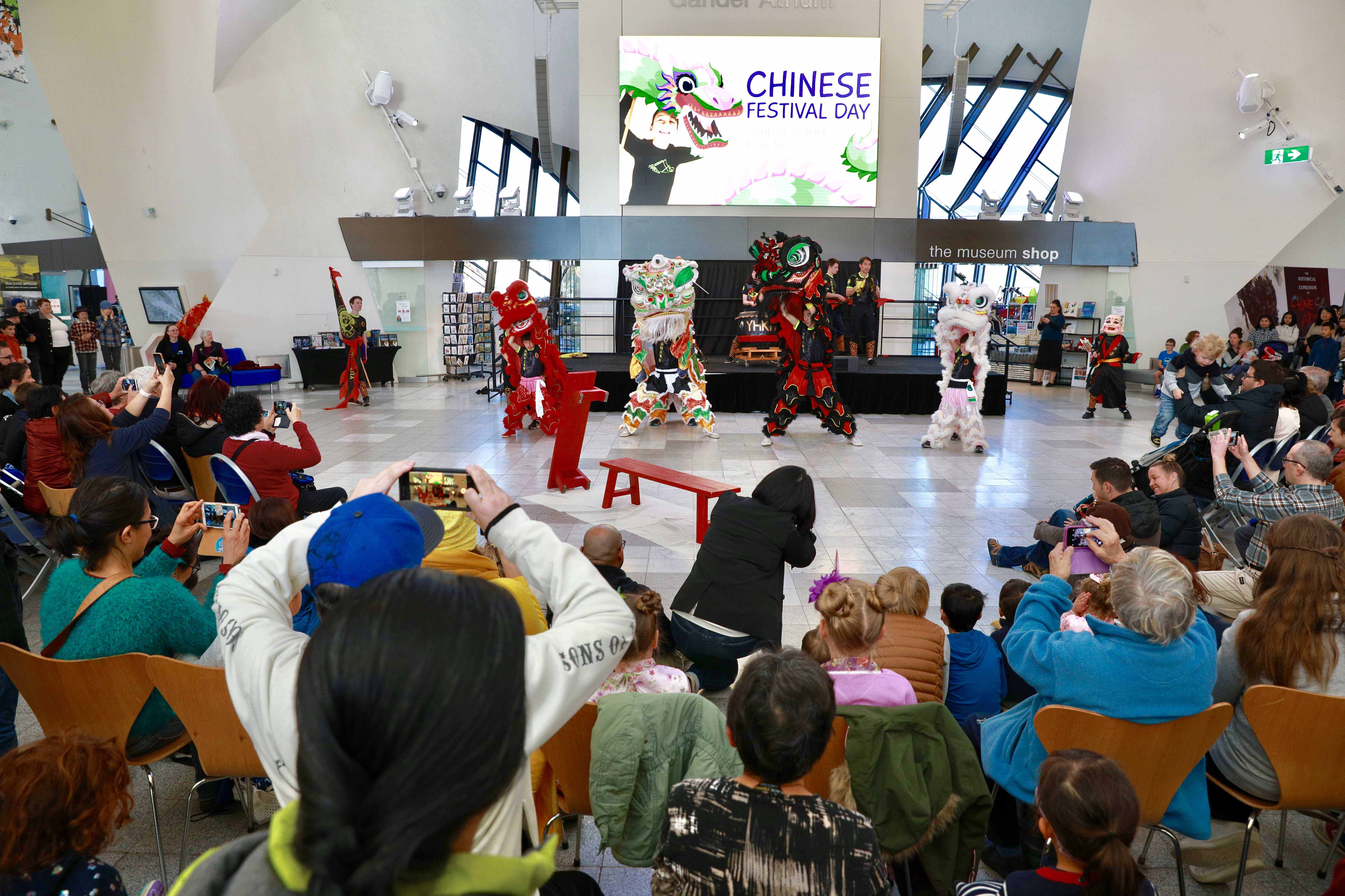 People watch lion dance during the Chinese Festival Day event at the National Museum of Australia in Canberra, Australia, July 21, 2019. (Photo by Chu Chen/Xinhua)