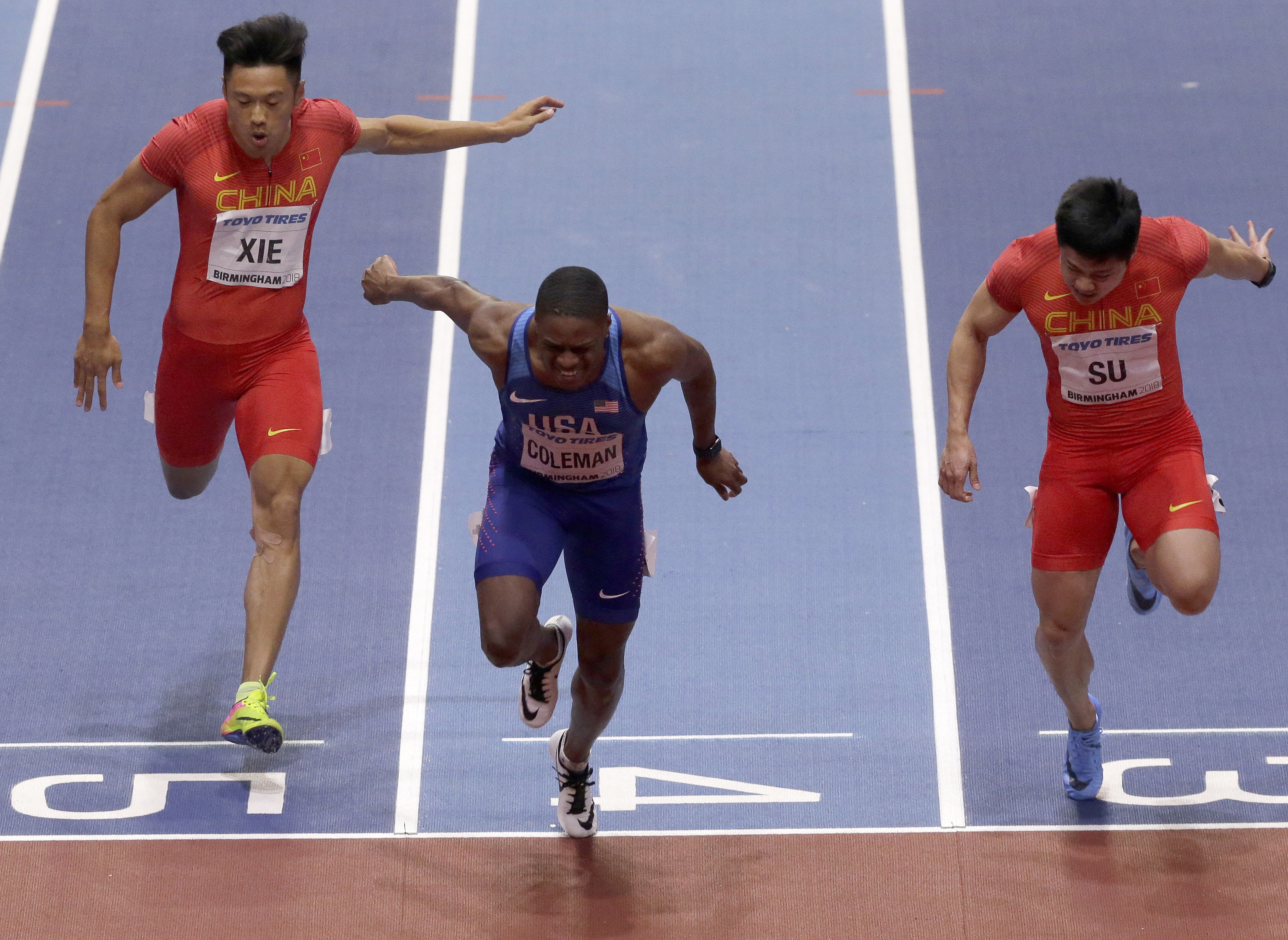 Su Bingtian (R) sprints with Christian Coleman (C) of the United States during the men's 60 meters final of the IAAF World Indoor Championships at Arena Birmingham in Birmingham, Britain, on March 3, 2018. Su blazed to an Asian record of 6.42 seconds to take the silver medal. (Xinhua/Tim Ireland)