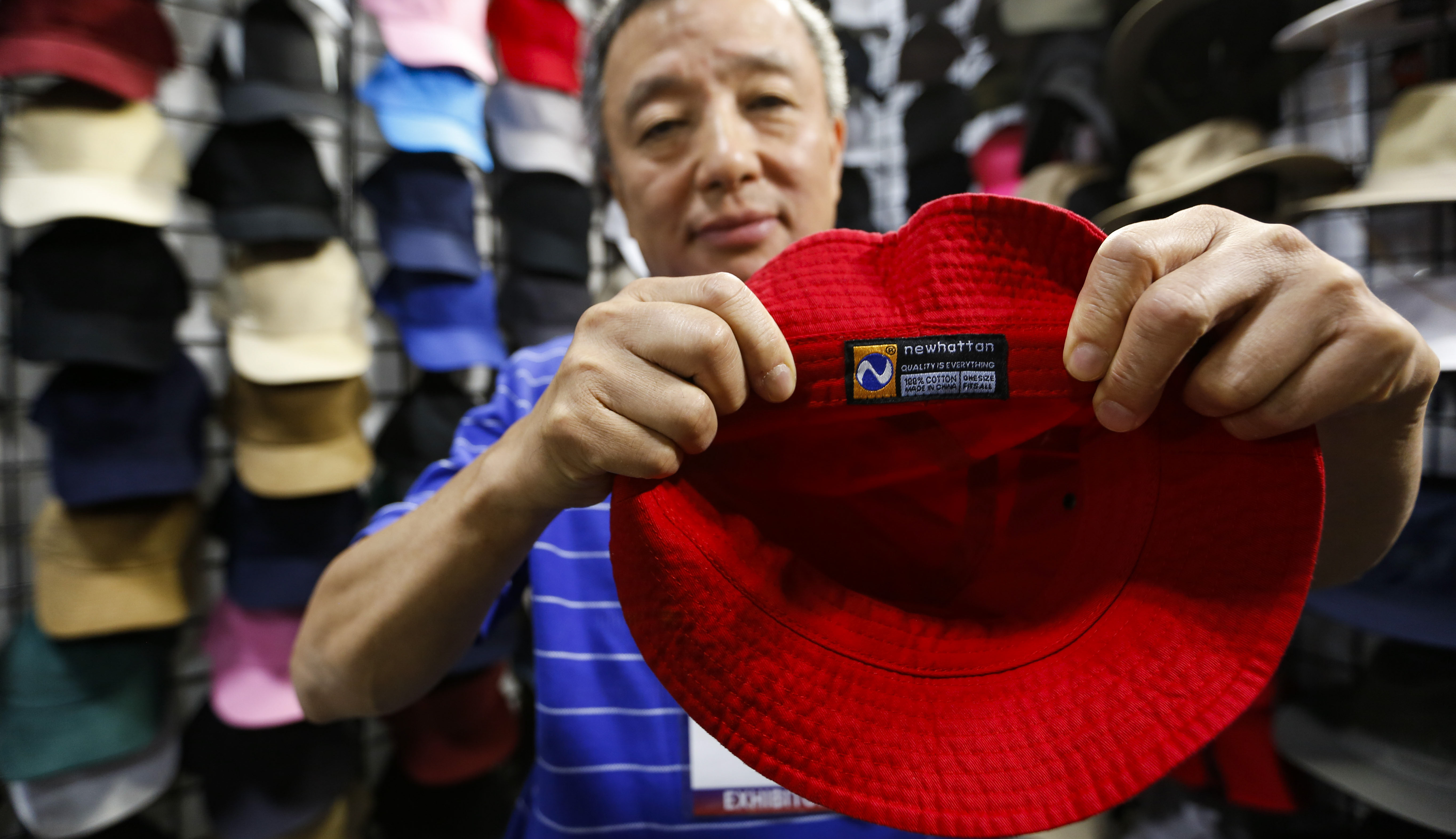 An exhibitor shows a hat made in China at the Off Price Show in Las Vegas, the United States, Aug. 11, 2019.(Xinhua/Li Ying)