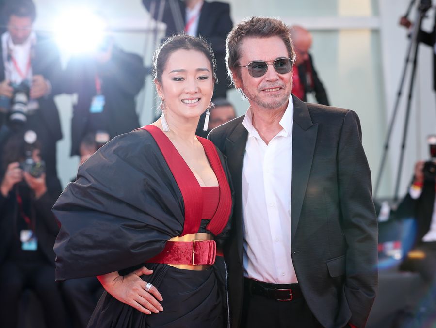 Chinese actress Gong Li poses on the red carpet with her husband Jean-Michel Jarre for the premiere of the film "Saturday Fiction" during the 76th Venice International Film Festival in Venice, Italy, Sept. 4, 2019. (Xinhua/Cheng Tingting)