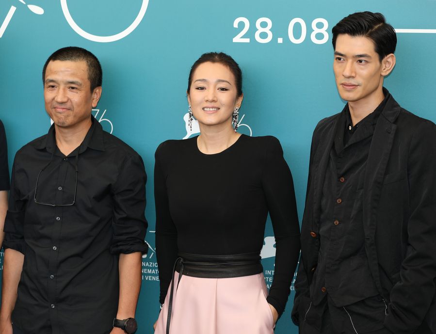 Chinese director Lou Ye, actress Gong Li and actor Ayumu Nakajima (L to R) attend a photocall for the film "Saturday Fiction" at the 76th Venice Film Festival in Venice, Italy, Sept. 4, 2019. (Xinhua/Cheng Tingting)