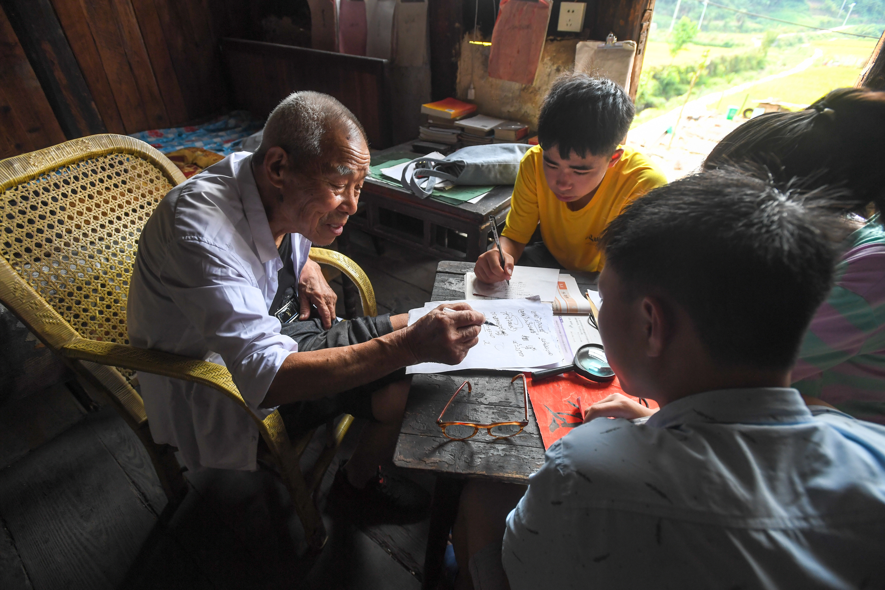 Tang Shangjun tutors students at his home in Wuhan Village of Anhua County in Yiyang City, central China's Hunan Province, Sept. 8, 2019. (Xinhua/Chen Zeguo)