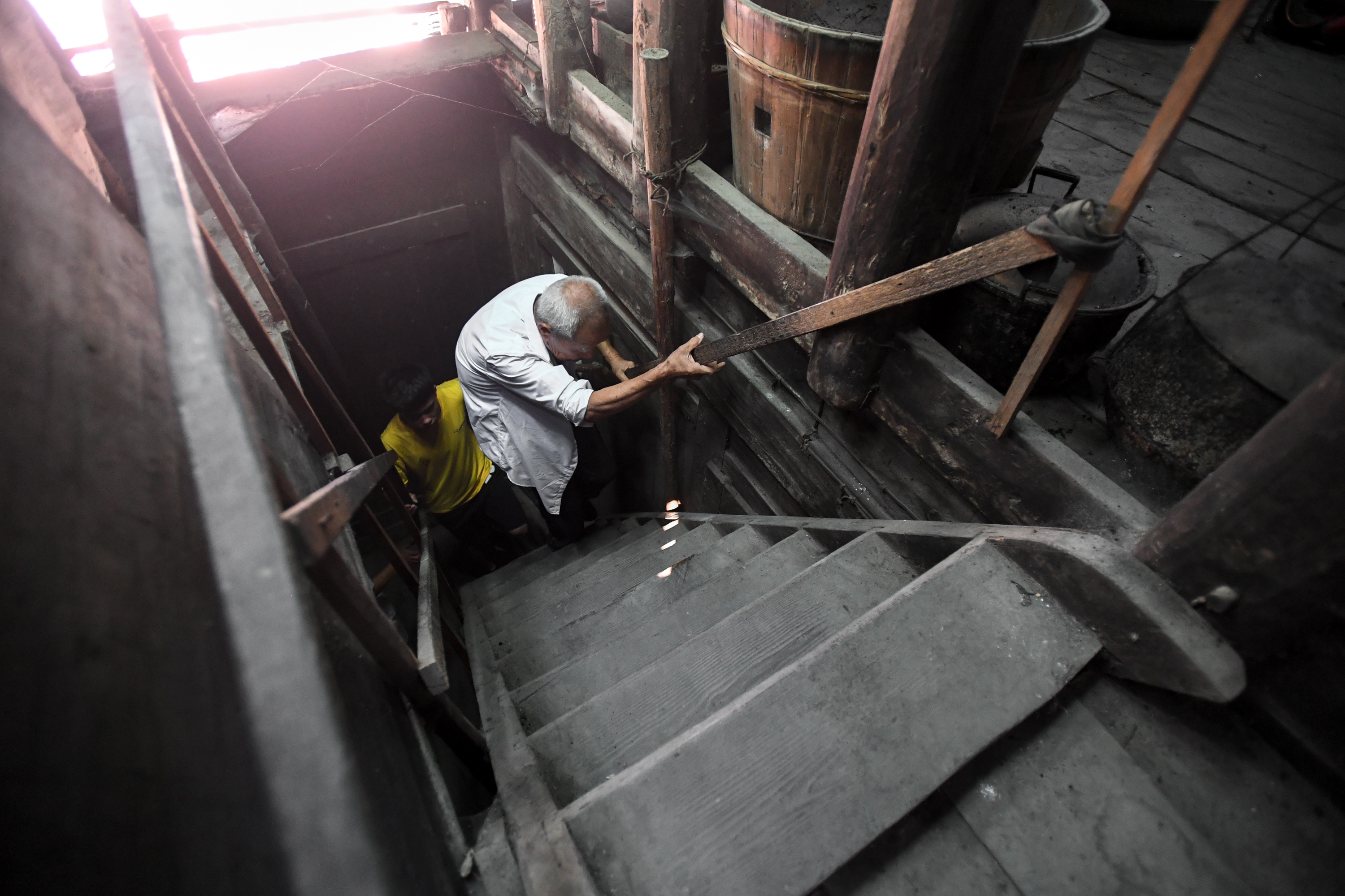 Tang Shangjun and his student walk upstairs for a class at his home, Sept. 8, 2019. (Xinhua/Chen Zeguo)