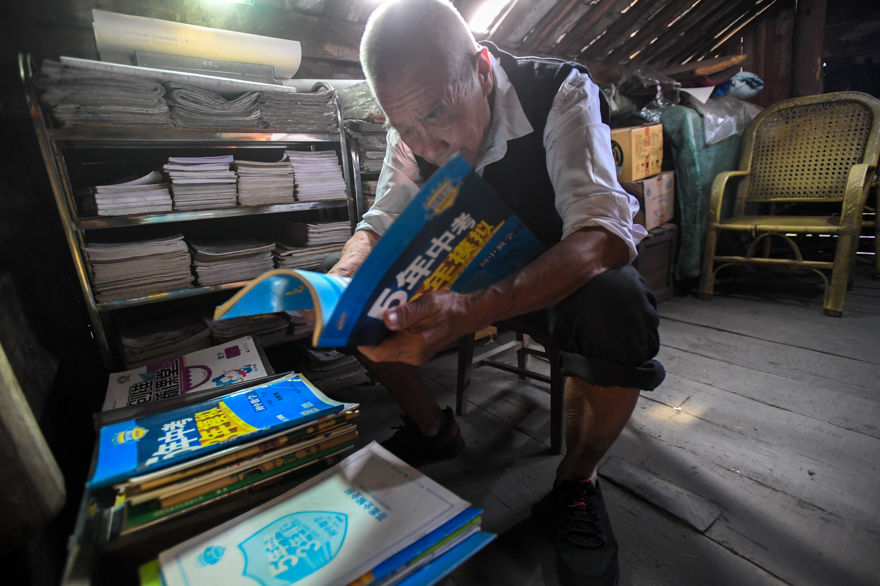 Tang Shangjun sorts teaching materials he bought at home, Sept. 8, 2019. (Xinhua/Chen Zeguo)