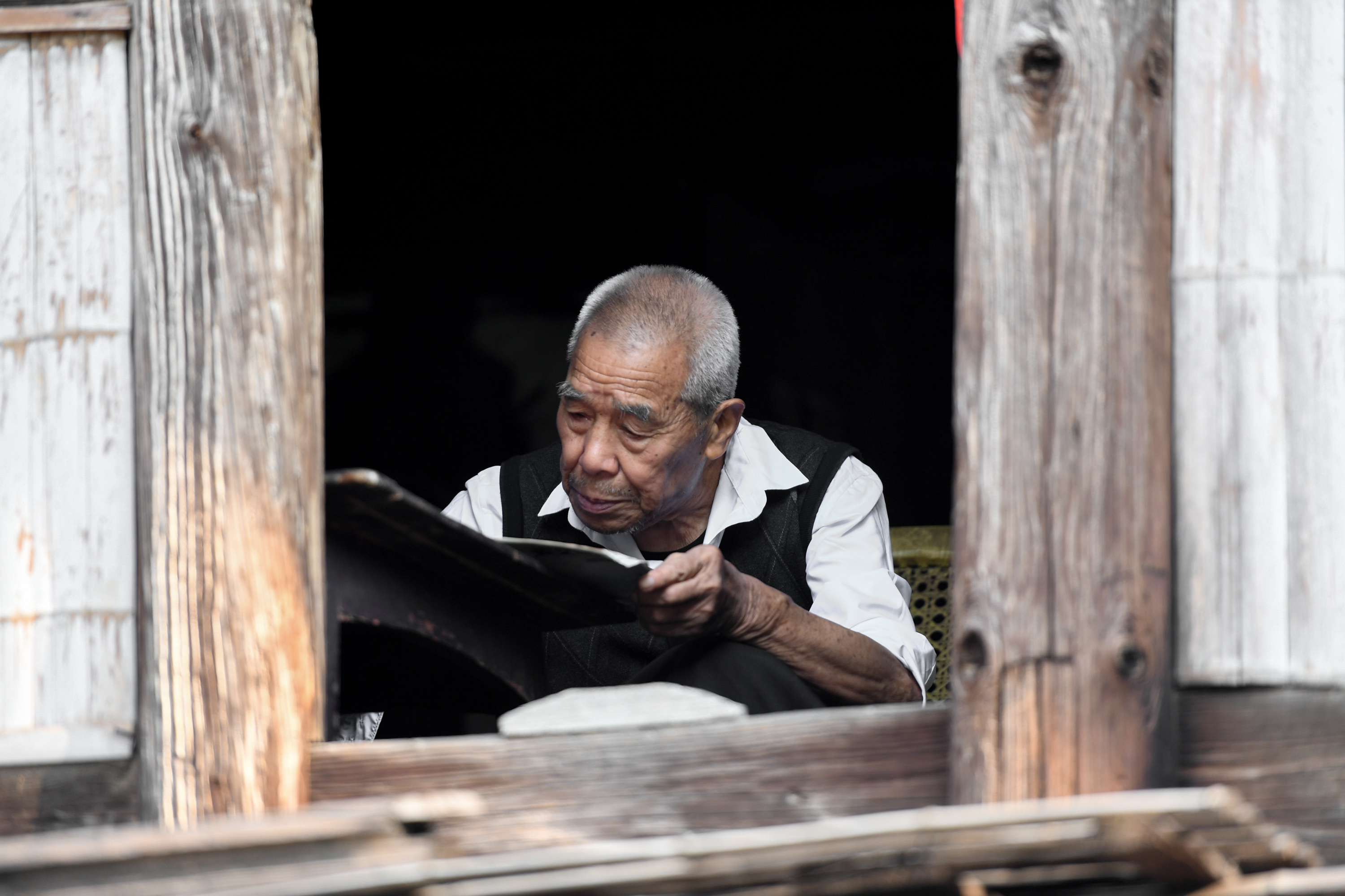Tang Shangjun reads questions via a magnifier at home, Sept. 7, 2019. (Xinhua/Chen Zeguo)