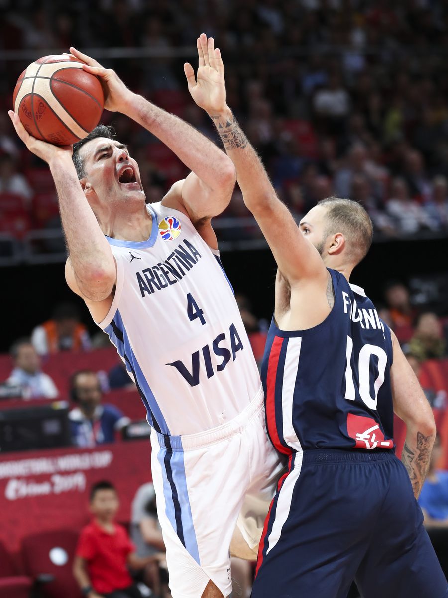 Scola (L) shoots as Evan Fournier of France defends during the semifinal match between Argentina and France at the 2019 FIBA World Cup in Beijing, capital of China, Sept. 13, 2019. (Xinhua/Meng Yongmin)