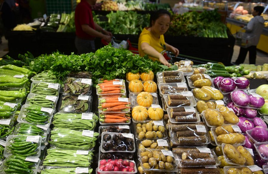 A customer selects vegetables at a supermarket in Wuxi City, east China's Jiangsu Province, June 12, 2019. (Xinhua/Huan Yueliang)