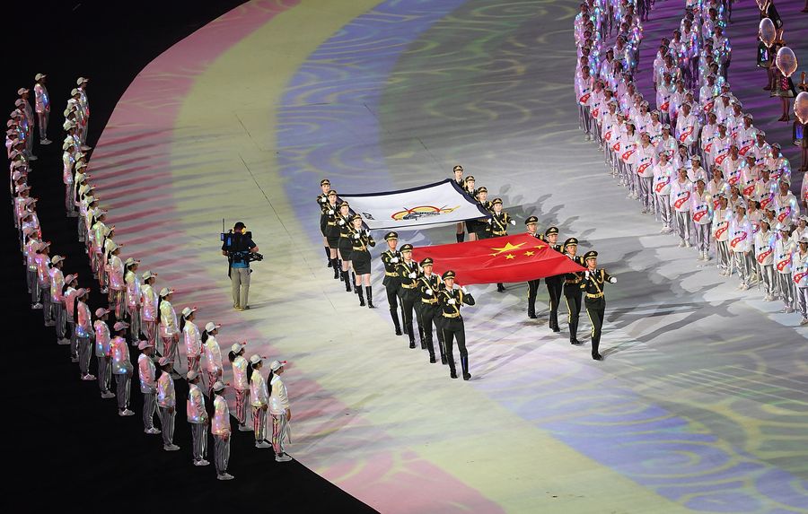 The national flag of the People's Republic of China and the flag of the International Military Sports Council (CISM) are carried into the stadium during the opening ceremony of the 7th CISM Military World Games in Wuhan, capital of central China's Hubei Province, Oct. 18, 2019.(Xinhua/Cheng Min)