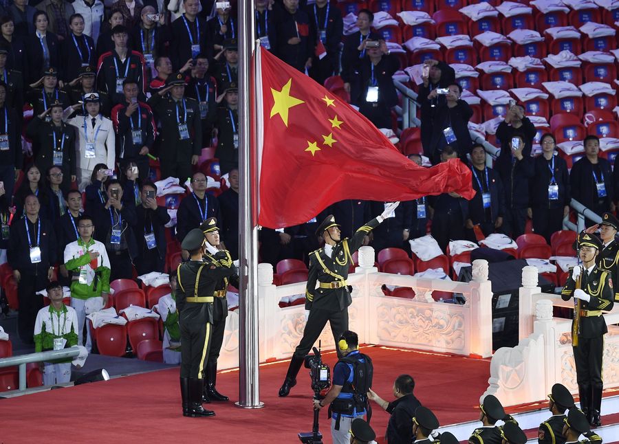 The Chinese national flag is raised during the opening ceremony of the 7th International Military Sports Council (CISM) Military World Games in Wuhan, capital of central China's Hubei Province, Oct. 18, 2019.(Xinhua/Wang Peng)