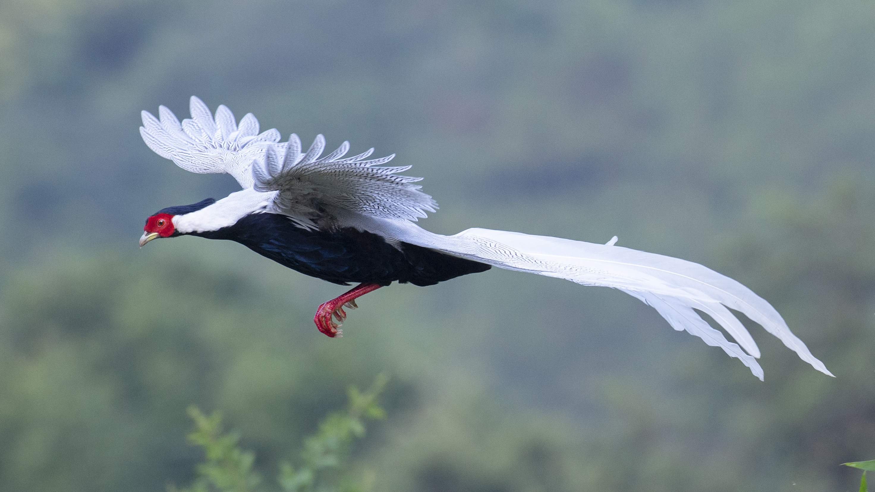A silver pheasant flies in the Exiandong nature reserve in Nanjing County, southeast China's Fujian Province, Oct. 20, 2019. (Xinhua/Mei Yongcun)