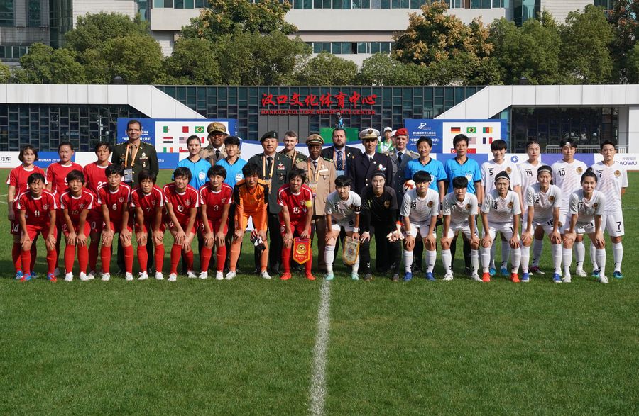 Herve Piccirillo, president of International Military Sports Council (CISM) poses to take picture with women's soccer players of DPR Korea and South Korea before the semifinal match at Military World Games. (Xinhua/He Changshan)