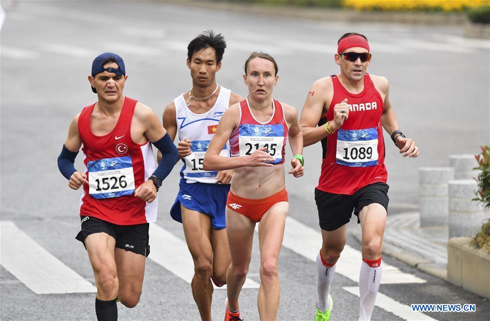 Athletes compete during the marathon of track and field at the 7th CISM Military World Games in Wuhan, capital of central China's Hubei Province, Oct. 27, 2019. (Xinhua/Hu Huhu)