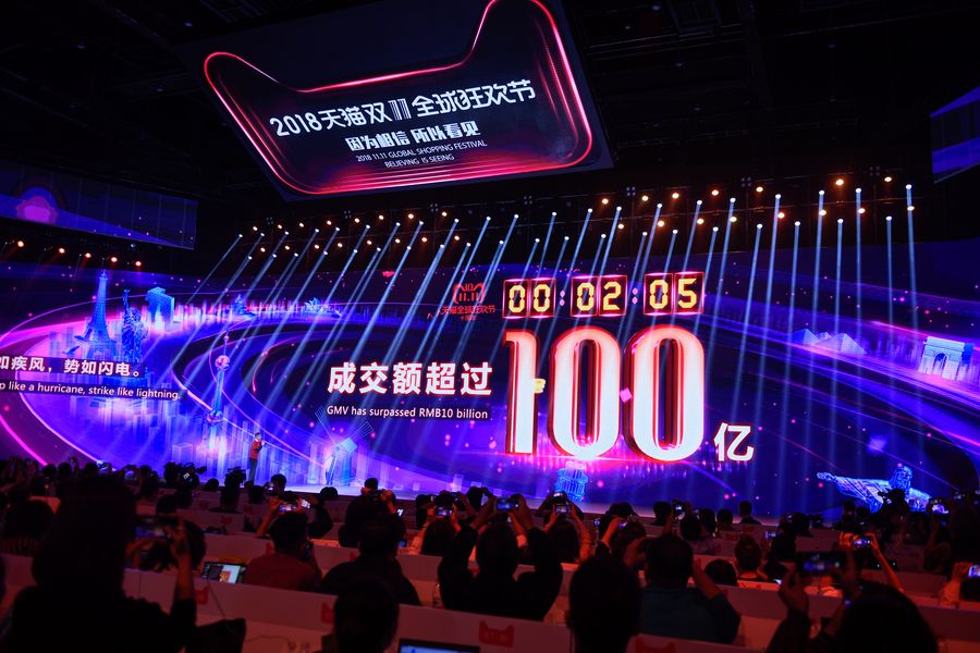 A giant screen displays sales at just two minutes and five seconds on Alibaba's online marketplace Tmall for Singles' Day shopping spree in Shanghai, east China, Nov. 11, 2018. (Xinhua/Huang Zongzhi)
