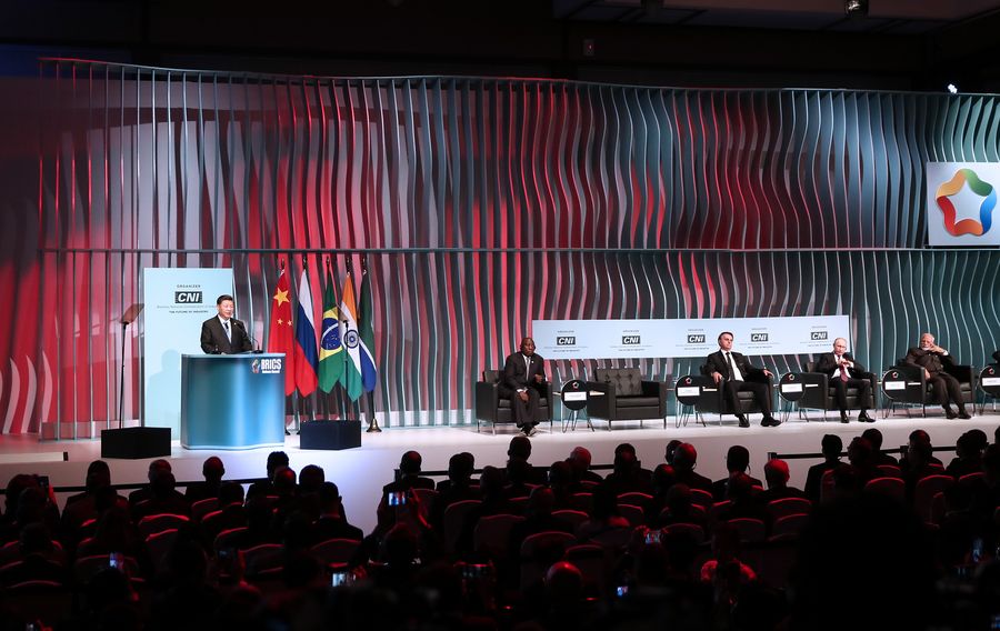 Chinese President Xi Jinping speaks at the closing ceremony of the BRICS business forum in Brasilia, Brazil, Nov. 13, 2019. (Xinhua/Lan Hongguang)