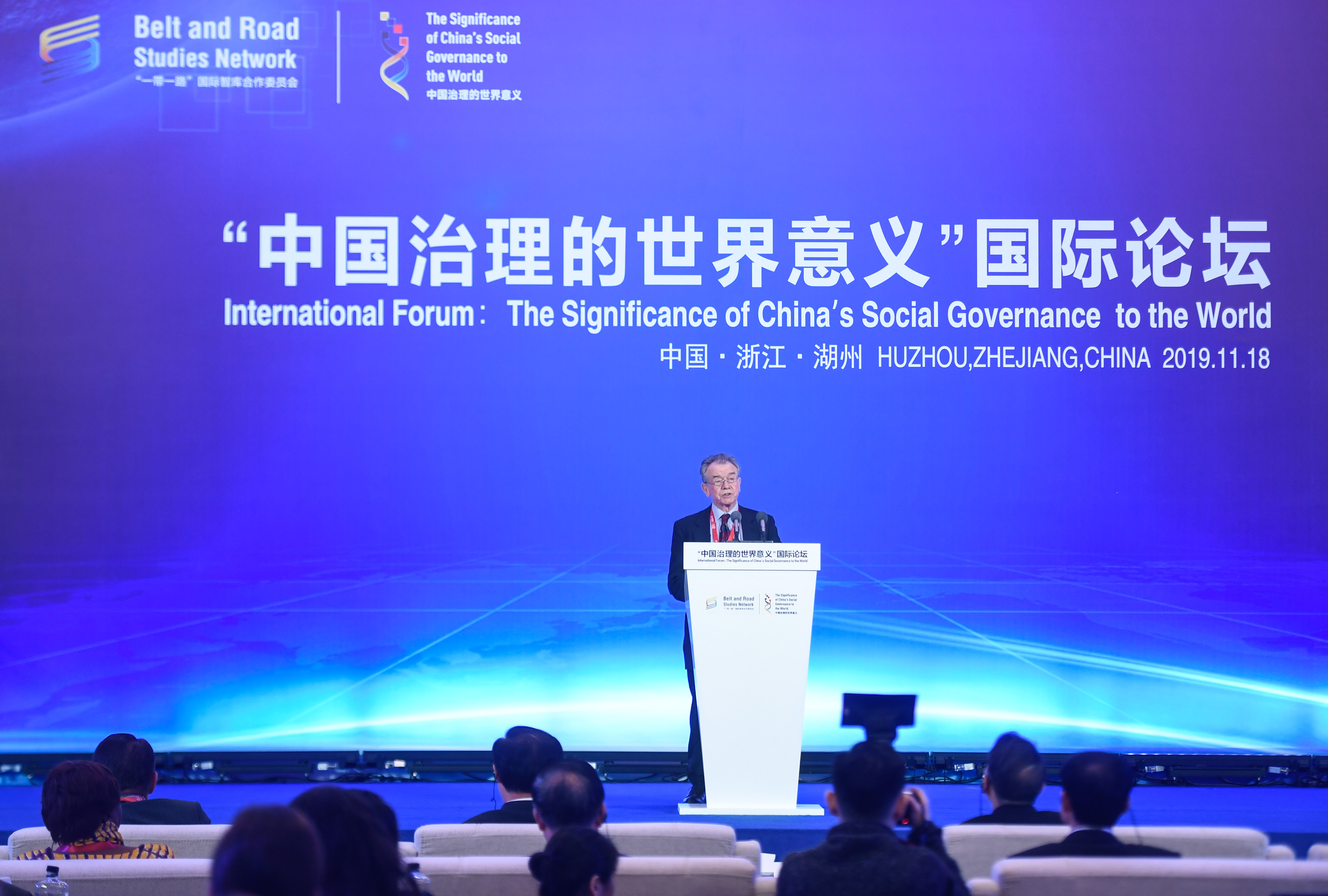 British sociologist Martin Albrow addresses the "International Forum: The Significance of China's Social Governance to the World" in Huzhou, east China's Zhejiang Province, Nov. 18, 2019. (Xinhua/Huang Zongzhi)
