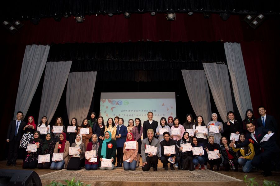Guests and students pose for group photos after the contest of dubbing films in the Chinese language in Ismailia, Egypt, on Dec. 16, 2019. (Xinhua/Wu Huiwo)