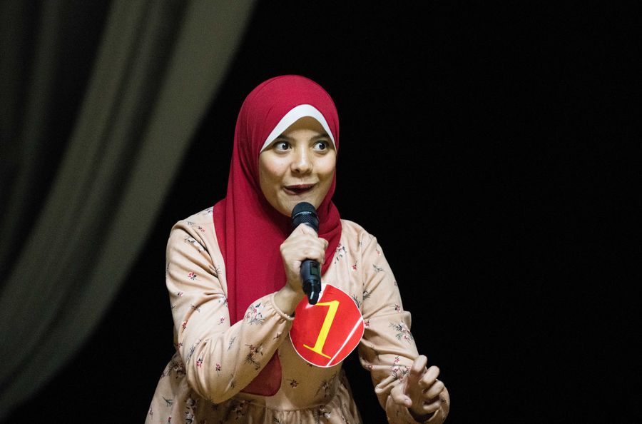 An Egyptian student performs during the contest of dubbing films in the Chinese language in Ismailia, Egypt, on Dec. 16, 2019. (Xinhua/Wu Huiwo)