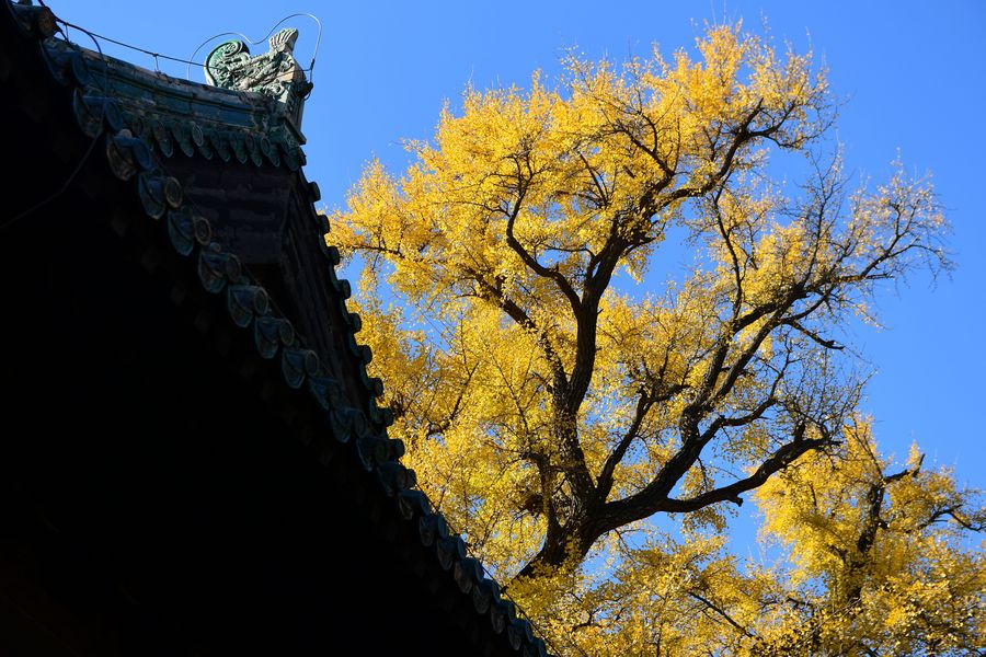 Ginkgo trees against the blue sky at Dajue Temple in Beijing. (Xinhua/Yin Dongxun)