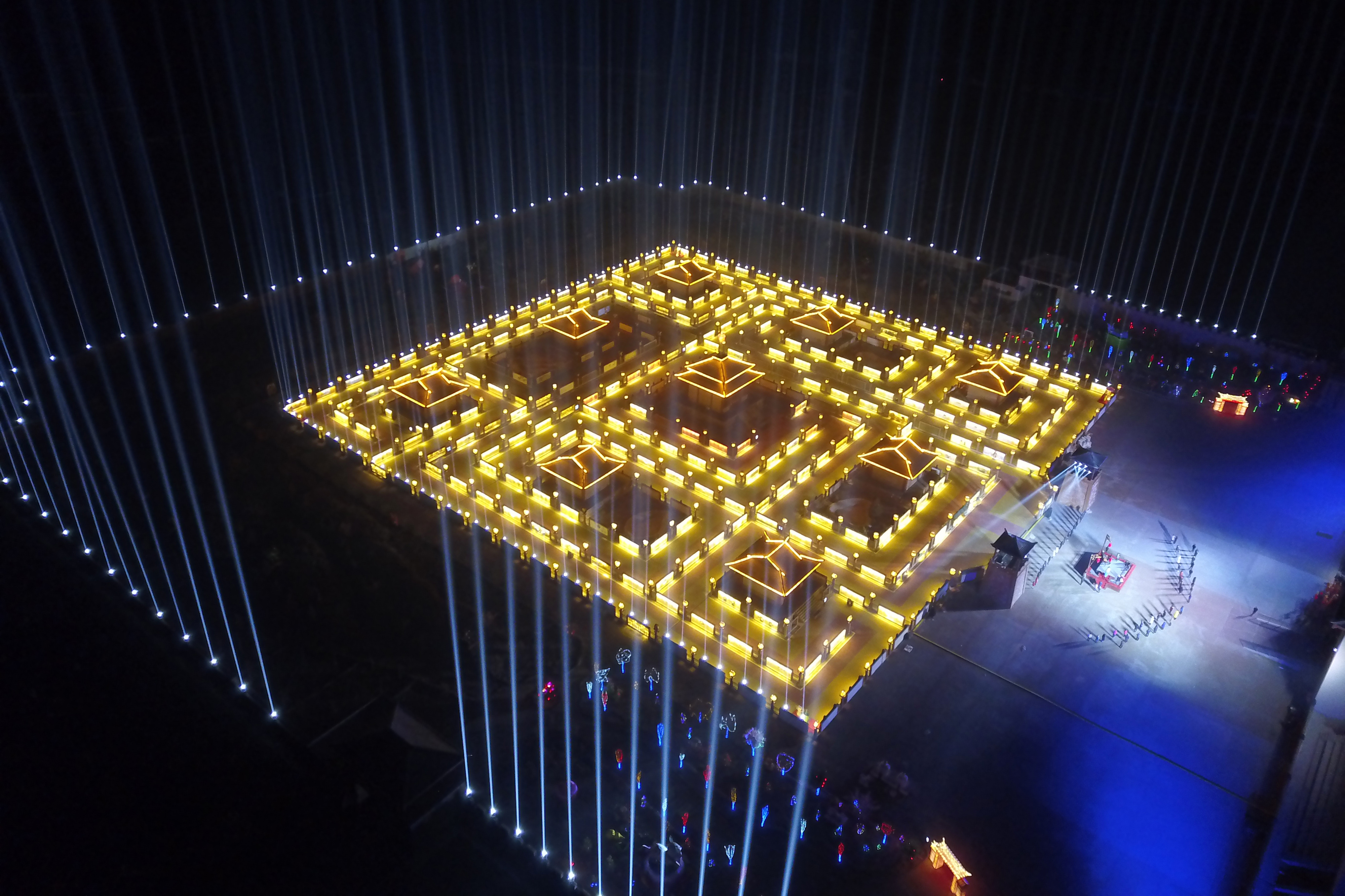 Aerial photo taken on Jan. 14, 2020 shows the lamp display in Gucheng Village of Jiantan Town, Zhangye City, northwest China's Gansu Province. (Xinhua/Ma Xiping)