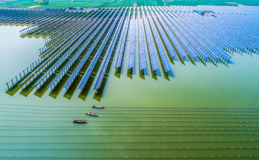 Photo taken on April 12, 2019 shows people working at a pearl farm in a reservoir in Weiying Town of Sihong County, east China's Jiangsu Province. Jiangsu has made great efforts to adjust the ecological layout, optimize the industrial structure and adhere to green development in recent years. (Xinhua/Zhang Lianhua)