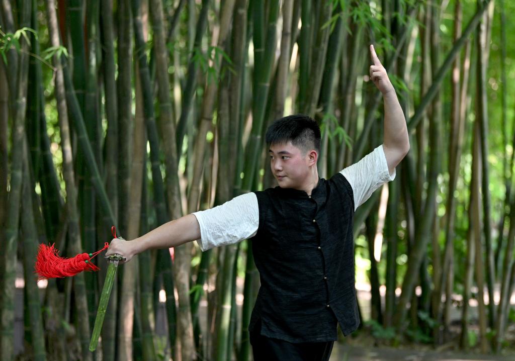 This photo taken on July 28, 2025 shows Min Pengfei exercising serving tea with a long spout kettle at a tea house in Chengdu, southwest China's Sichuan Province. (Xinhua/Xu Bingjie)This photo taken on July 28, 2025 shows Min Pengfei exercising serving tea with a long spout kettle at a tea house in Chengdu, southwest China's Sichuan Province. (Xinhua/Xu Bingjie)This photo taken on July 28, 2025 shows Min Pengfei brandishing a sword in Chengdu, southwest China's Sichuan Province. (Xinhua/Xu Bingjie)This photo taken on July 28, 2025 shows Min Pengfei exercising tossing and catching a long spout kettle in Chengdu, southwest China's Sichuan Province. 24-year-old Min was born in Ya'an of Sichuan, a city renowned for its tea and tea culture. (Xinhua/Xu Bingjie)This photo taken on July 30, 2025 shows people relaxing at a tea house in Chengdu, southwest China's Sichuan Province. (Xinhua/Xu Bingjie)