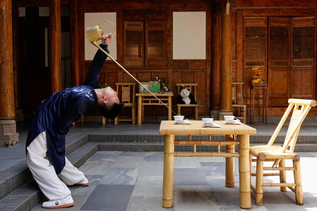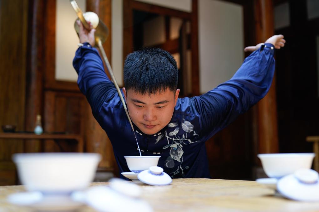 24-year-old Min Pengfei was born in Ya'an of Sichuan, a city renowned for its tea and tea culture. He has involved in tea picking and processing with his family since his childhood. At university, he started to learn the technique of serving tea with a long spout kettle. Currently, as a municipal-level inheritor of the technique, Min has endeavored to demonstrate and pass down the tea art that integrates martial arts and dance.
