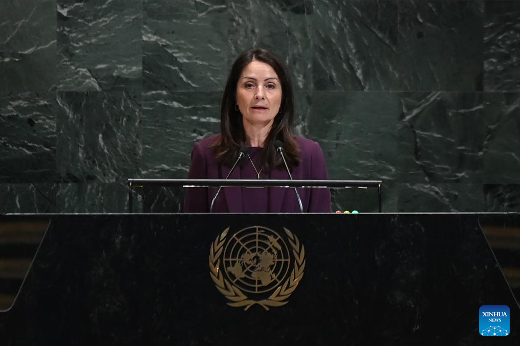 Danish Permanent Representative to the United Nations Christina Markus Lassen delivers a speech during the General Debate of the 80th session of the United Nations General Assembly (UNGA) at the UN headquarters in New York, on Sept. 29, 2025. (Xinhua/Li Rui)