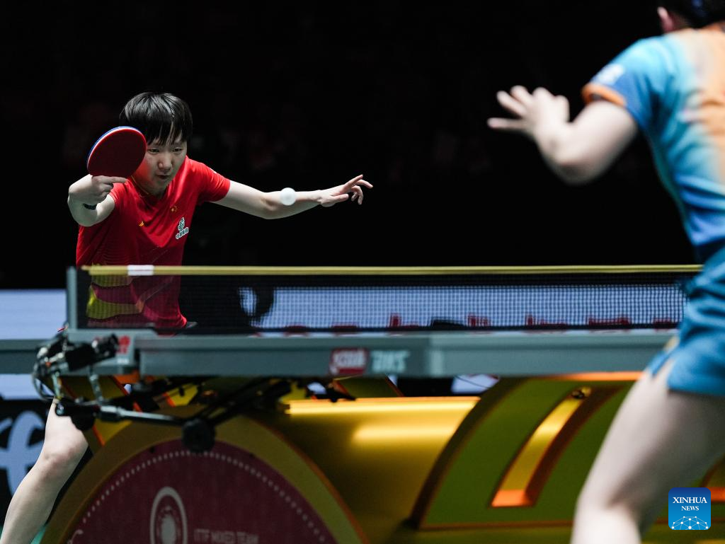 Wang Chuqin/Sun Yingsha (R) of China compete in the mixed doubles match against Matsushima Sora/Odo Satsuki of Japan during the final match between China and Japan at the ITTF Mixed Team World Cup 2025 in Chengdu, southwest China's Sichuan Province, Dec. 7, 2025. (Xinhua/Wang Xi)