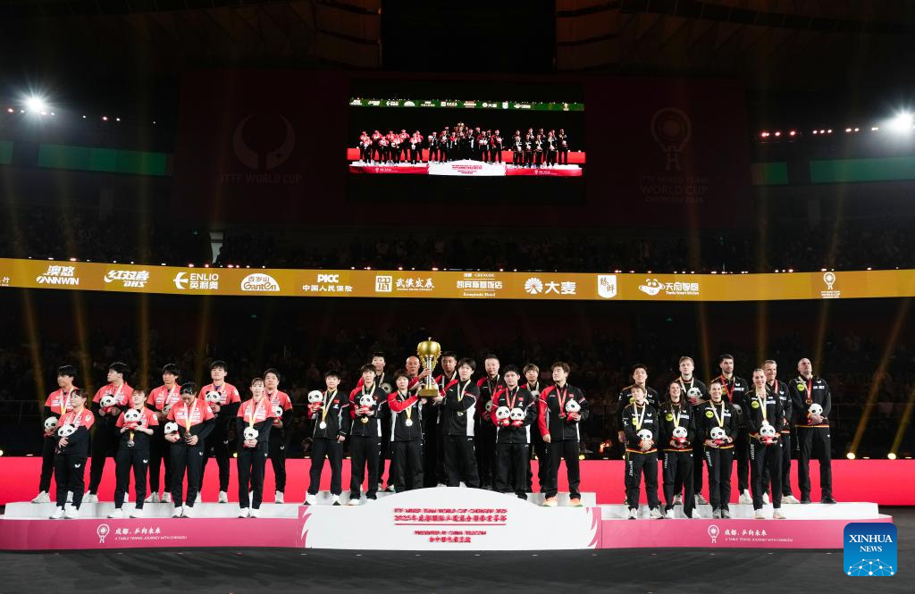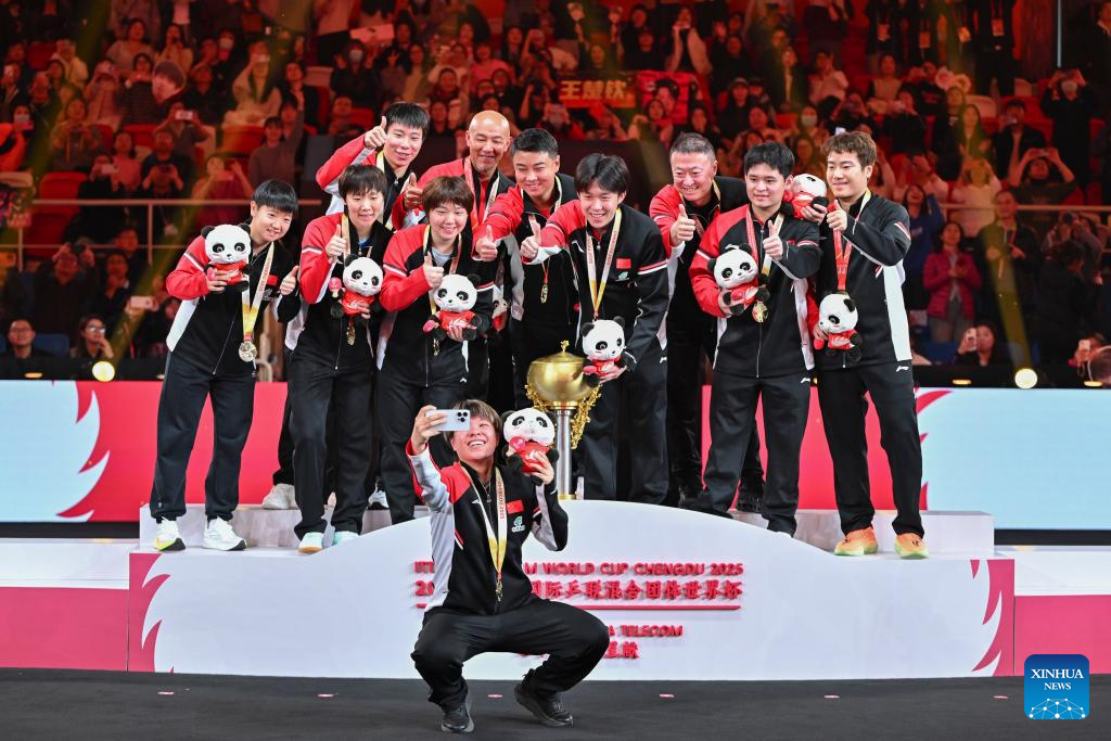 Gold medalists team China pose during the awarding ceremony at the ITTF Mixed Team World Cup 2025 in Chengdu, southwest China's Sichuan Province, Dec. 7, 2025. (Xinhua/Wang Ying)