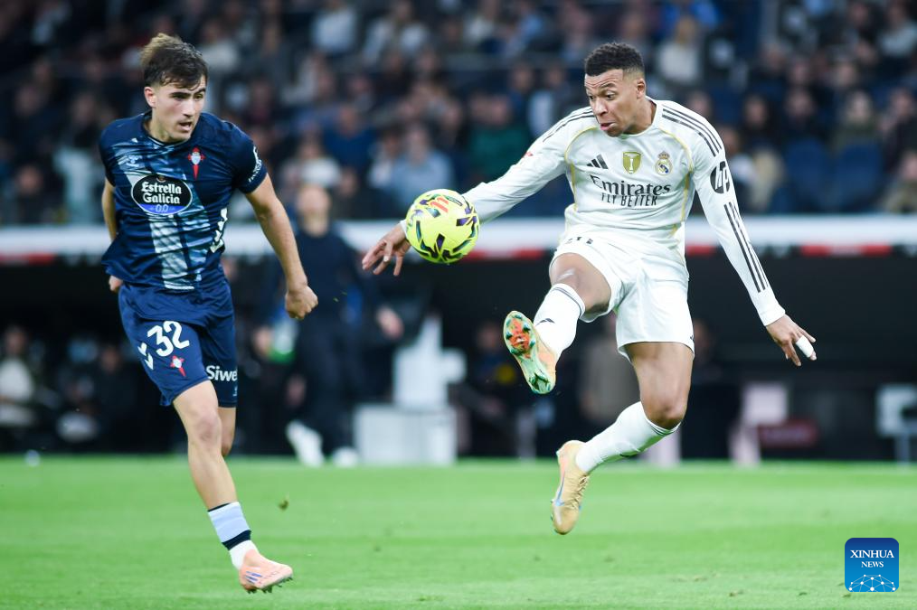 Real Madrid's Kylian Mbappe (R) vies with Celta Vigo's Javi Rodriguez during a La Liga football match between Real Madrid and Celta Vigo at Santiago Bernabeu stadium in Madrid, Spain, on Dec. 7, 2025. (Photo by Gustavo Valiente/Xinhua)