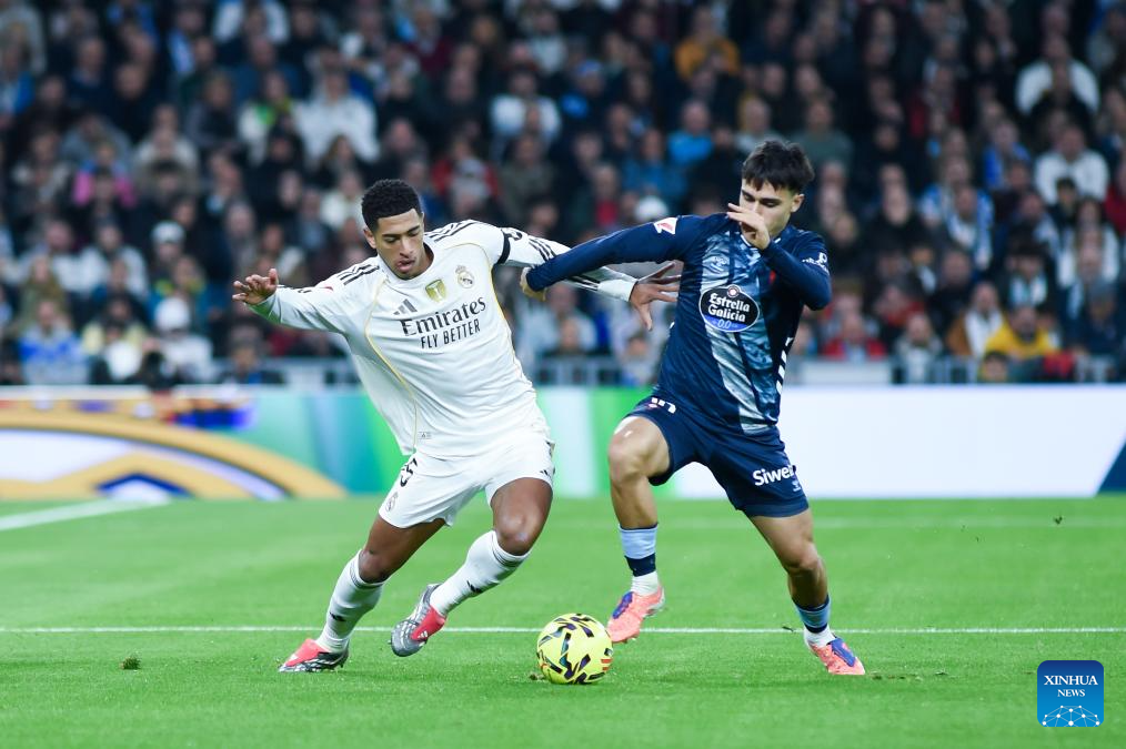 Real Madrid's Jude Bellingham (L) vies with Celta Vigo's Miguel Roman during a La Liga football match between Real Madrid and Celta Vigo at Santiago Bernabeu stadium in Madrid, Spain, on Dec. 7, 2025. (Photo by Gustavo Valiente/Xinhua)