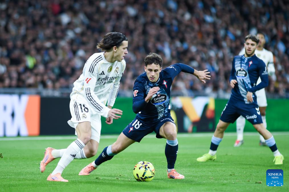 Celta Vigo's players celebrate a goal during a La Liga football match between Real Madrid and Celta Vigo at Santiago Bernabeu stadium in Madrid, Spain, on Dec. 7, 2025. (Photo by Gustavo Valiente/Xinhua)