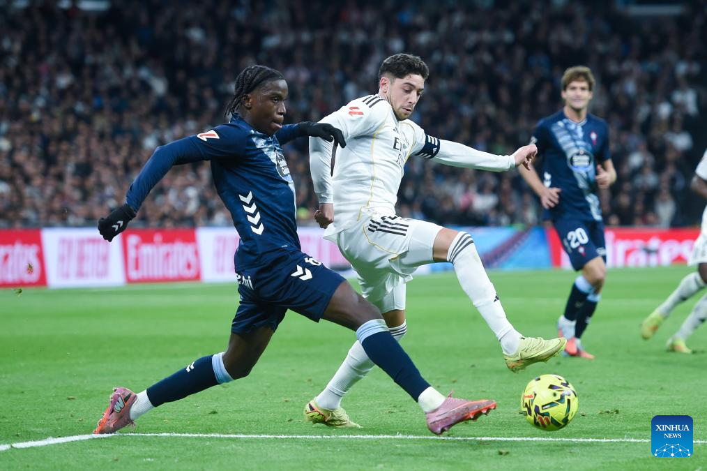 Real Madrid's Federico Valverde (C) competes during a La Liga football match between Real Madrid and Celta Vigo at Santiago Bernabeu stadium in Madrid, Spain, on Dec. 7, 2025. (Photo by Gustavo Valiente/Xinhua)