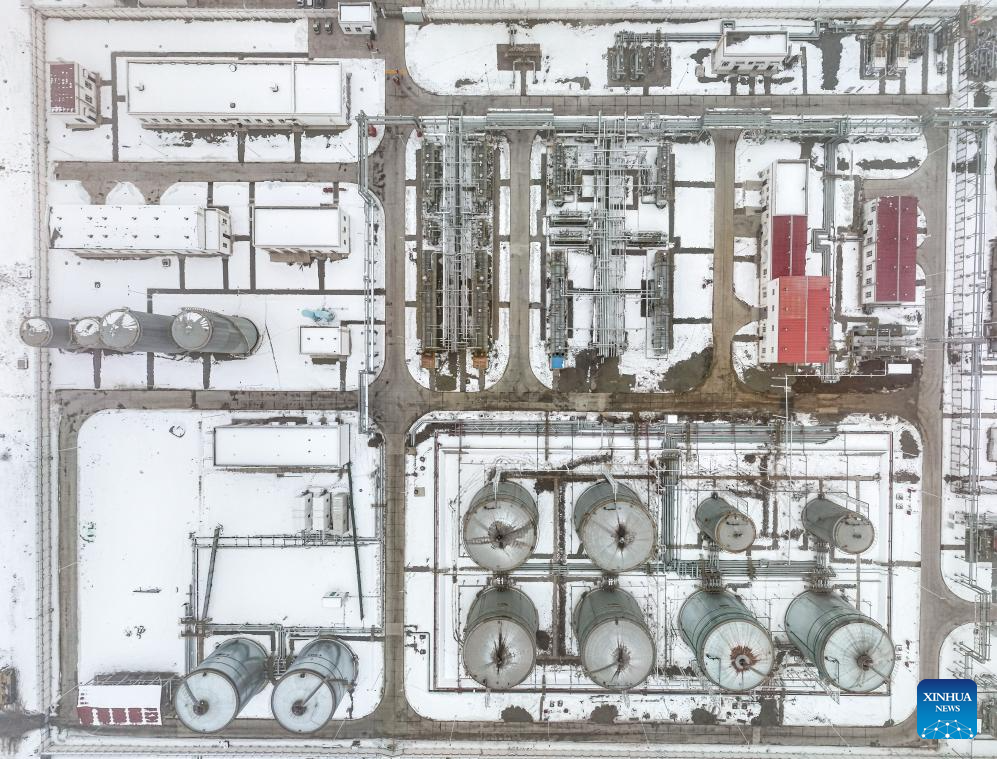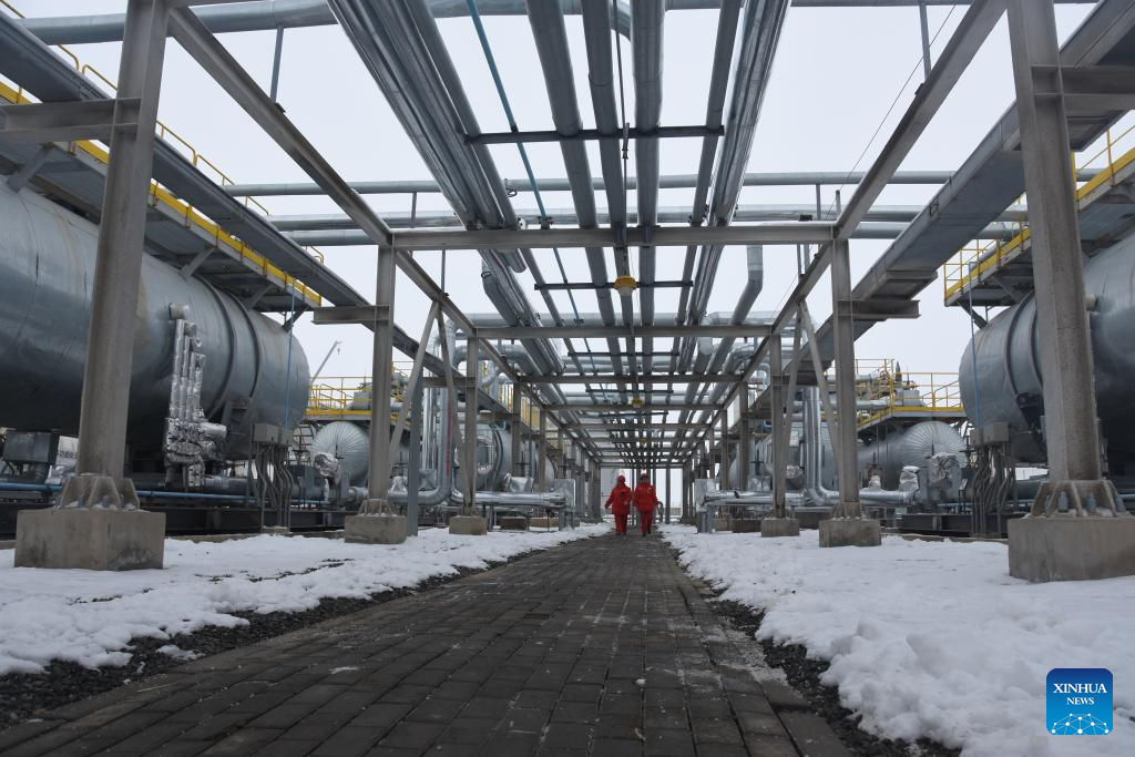 Workers check equipment at Jimsar national-level shale oil production zone in the Junggar Basin of northwest China's Xinjiang Uygur Autonomous Region, Dec. 8, 2025. A major shale oil production zone in northwest China's Xinjiang Uygur Autonomous Region reported its crude oil output exceeding 1.7 million tonnes so far this year, marking a significant breakthrough in the country's shale oil development, China National Petroleum Corporation (CNPC) announced on Tuesday. (Xinhua/Gu Yu)