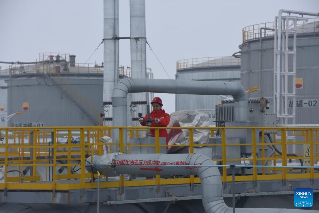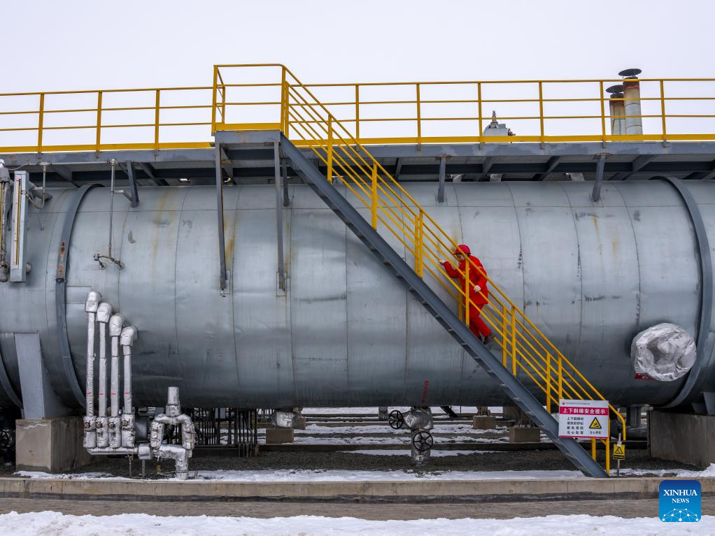 A worker checks equipment at Jimsar national-level shale oil production zone in the Junggar Basin of northwest China's Xinjiang Uygur Autonomous Region, Dec. 8, 2025. A major shale oil production zone in northwest China's Xinjiang Uygur Autonomous Region reported its crude oil output exceeding 1.7 million tonnes so far this year, marking a significant breakthrough in the country's shale oil development, China National Petroleum Corporation (CNPC) announced on Tuesday. (Xinhua/Gu Yu)